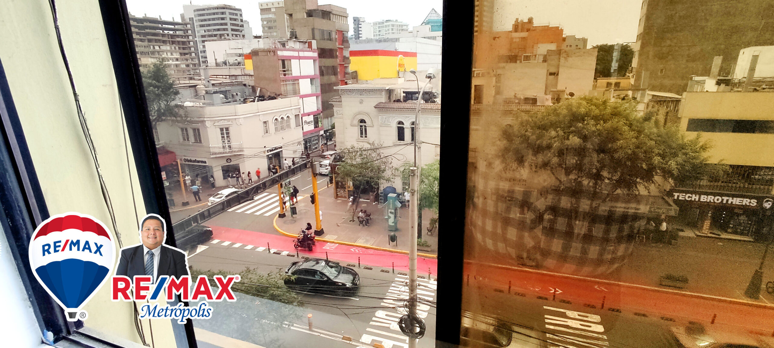 Se alquila amplia, estratégica y céntrica oficina en la mejor zona de Miraflores en el tercer piso de edificio empresarial con excelente iluminación y ventilación pues tiene amplia ventana de pared a pared con magnífica vista y patio interior con amplio ventanal.